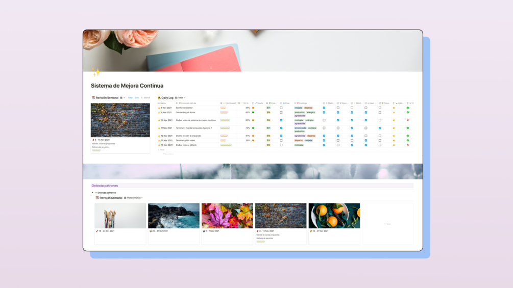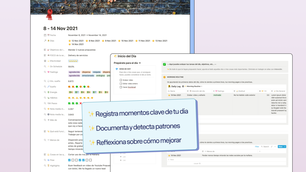 Esta pequeña herramienta está sacada de mi propio sistema operativo en Notion, y está pensada como una combinación entre Bullet Journaling y Registro de Hábitos. Dos prácticas que, juntas, pueden ayudarnos a mejorar nuestra gestión emocional y psicológica respecto a cómo trabajamos, qué sentimos y qué hacemos para ser mejores cada día.