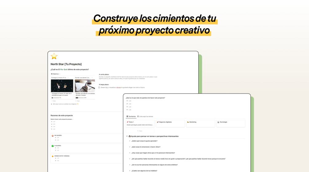 Un documento North Star es ese documento que te permite volcar inspiración, referencias e ideas a la hora de empezar a construir tu proyecto creativo. Un lugar en el que preguntarte las razones por las que lo emprendes, a quién quieres dirigirte y por tus objetivos a medio y largo plazo.